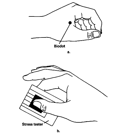 Place the sensors again as you had them before, either on top of your hands, or between your thumbs and index fingers. After 15 seconds, write the color on the sensor next to number one. After 15 seconds, record the color of the sensor beside number 2.